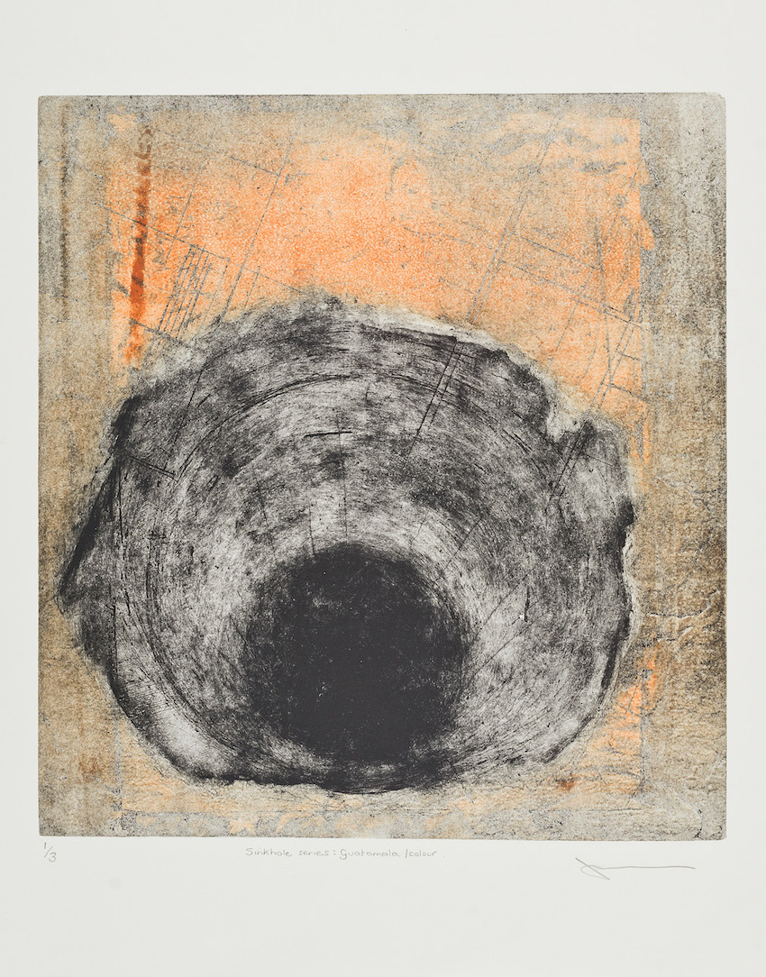 Jill Randall often creates multi-layered prints combining several different print methods. She likes the alchemy of printmaking-the transformational processes and traditional materials of the medium-beeswax, straw hat varnish, aquatint resin. Subject-matter has parallels with her sculpture practice, and explores natural and extraordinary phenomena in landscapes and the environment, mining sites, mapping and hidden or invisible places such as the ocean floor or abandoned mine workings. She works with unconventional, often abject subject matter such as sinkholes, fatbergs and new volcanic islands.
